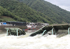 翻板壩阻水,經不住洪水的沖擊,易被漂浮物卡塞或上游淤積造成不能自動翻板,容易被洪水沖壞壩體影響防洪安全。洪水過后翻板門再關上時被異物卡住,造成大量漏水,一旦淤積厚度較大或泥沙板結,閘門就不能正常回門(眾多閘門中只要有一扇),將影響河道正常蓄水。汛期漂浮物(特別是樹枝)經常卡住閘門導致起翻或回落困難,威脅到行洪安全。